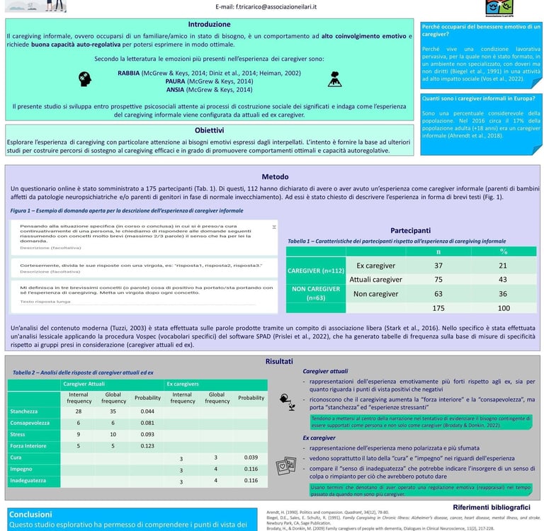 In uno studio in corso di realizzazione a cura di F. Tricarico, D. Romaioli e AM Meneghini si è scoperto che c'è una differenza fra caregiver che stanno vivendo l'esperienza e caregiver che l'hanno conclusa. Ovvero solo dopo averla conclusa è possibile avere la lucidità di vedere con distacco quello che è successo. Sembra una cosa scontata, ma ciò denota che una persona durante l'attività di cura, ha bisogno di essere aiutata a regolare le proprie emozioni (prevalentemente Rabbia Paura, Ansia (7)) senza dare per scontato che sia naturale occuparsi di un figlio, coniuge, amico, genitore, soprattutto per una donna (3) e progettando interventi efficaci e mirati in tal senso.
